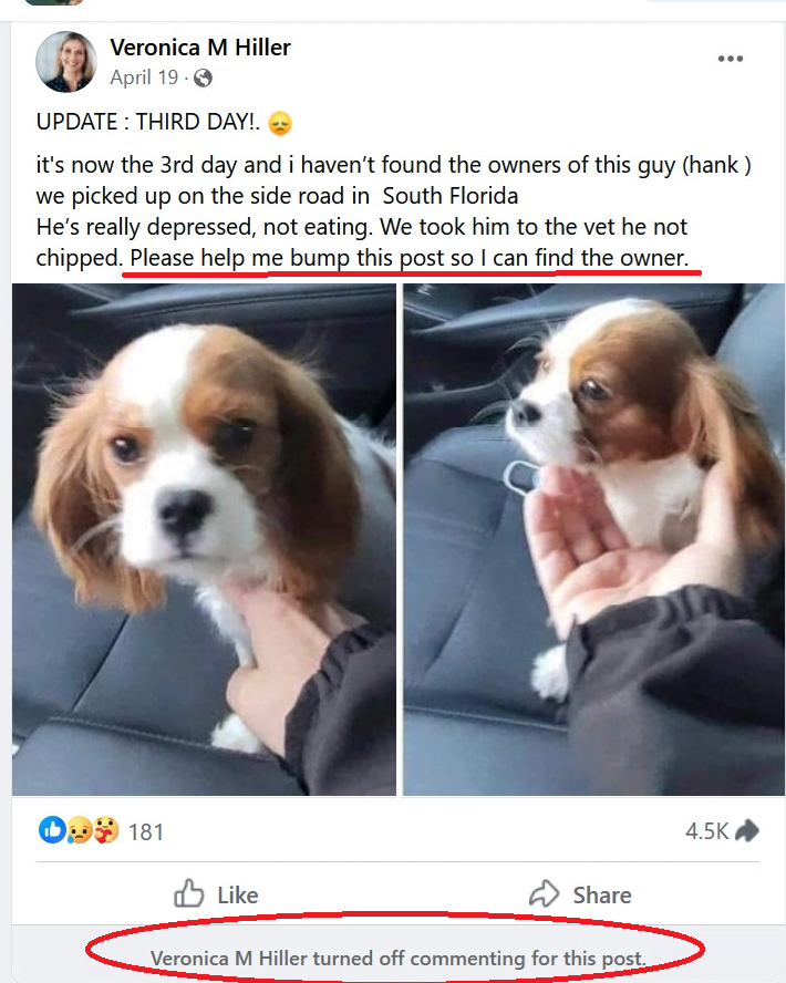 It’s not always injured pets they found. Sometimes it’s a child in trouble, or an old person who wandered off, or anything else that will make people share share share! After a few days, the post has dropped low enough in the group that the admin doesn’t see it and catch on to what they’re doing. The scammer will edit the post with an ad designed to scam anyone who falls for it. By this time, the post has been shared by hundreds, maybe thousands of people. Friends of the sharers will see it, and may respond. They may fall for the scam and get duped out of money, or give personal information that gets their account hacked, or whatever else the scammer is after. Be aware and stop sharing these scam posts.