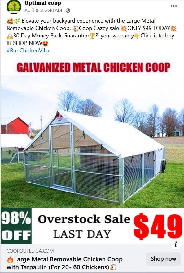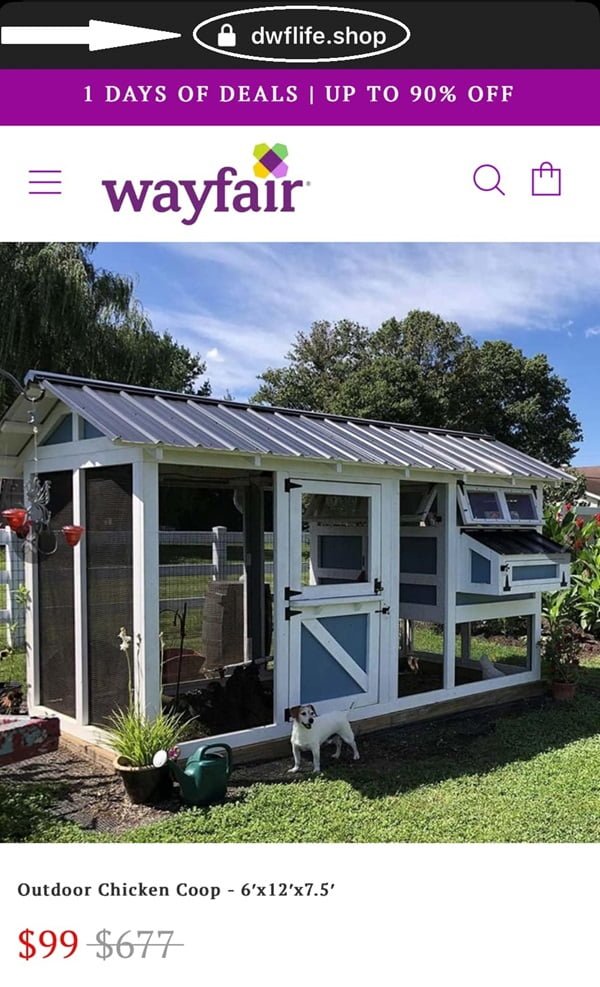 The first image pretends to be Wayfair. Note that the link does not go to Wayfair! The image was lifted from a legit small company called Carolina Coops, which is not associated with the scam or Wayfair.