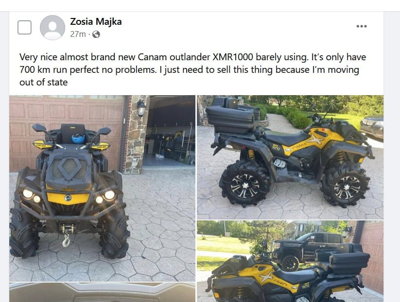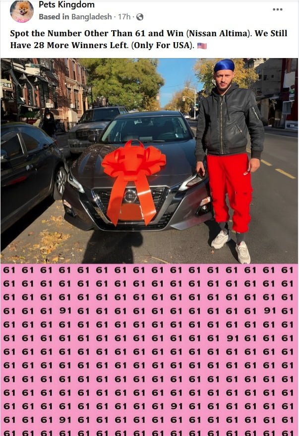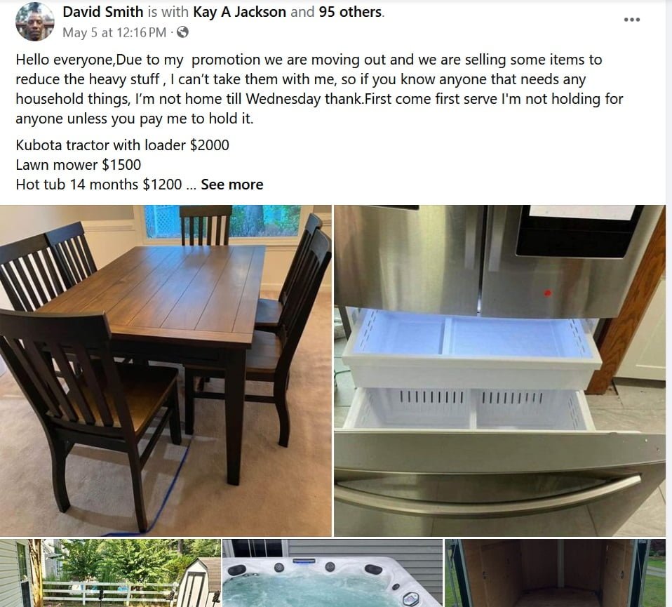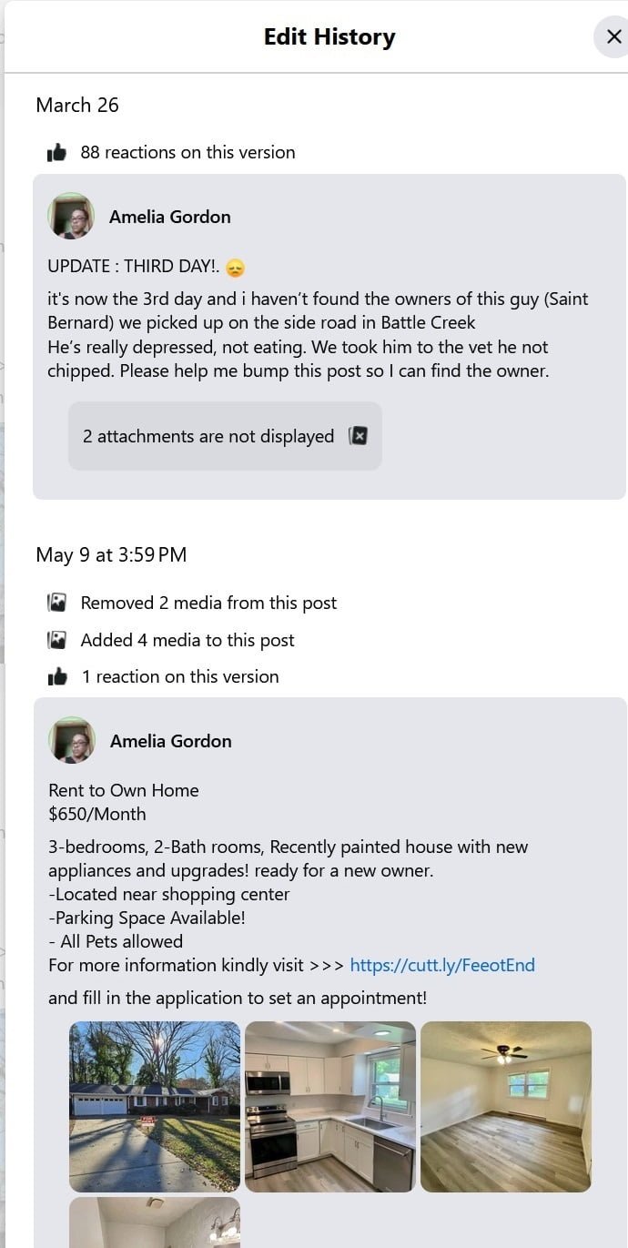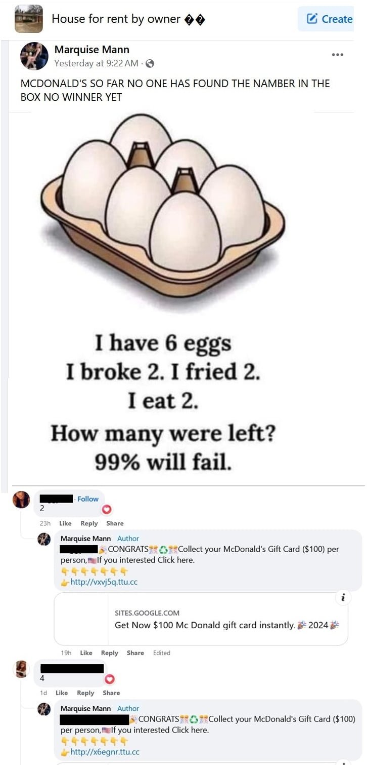 You can see that it started out as a “found dog” post. The scammer went back a few weeks later and changed it to a real estate ad. Sometimes the ad will be a ridiculously cheap house, like this one. Sometimes it will be something else. Whatever it is, it’s designed to make people curious enough to click the link. DON’T CLICK THE LINK! They are either trying to get your personal information, or your device will be infected with malware.