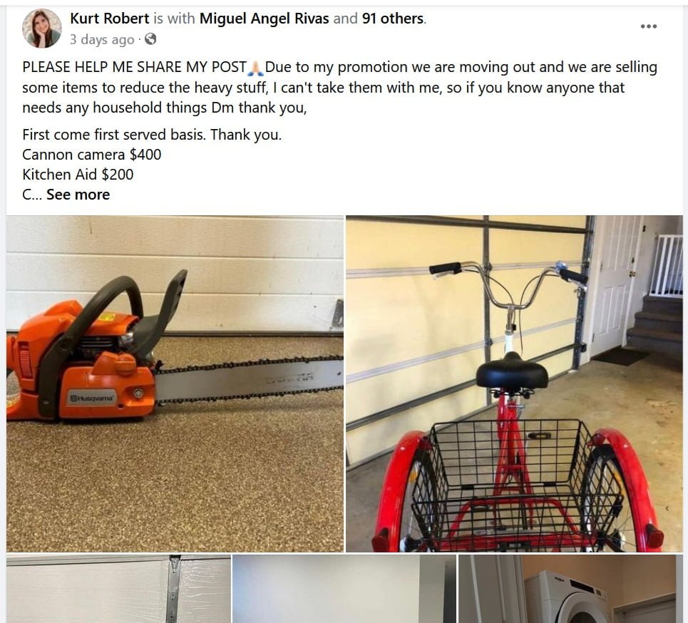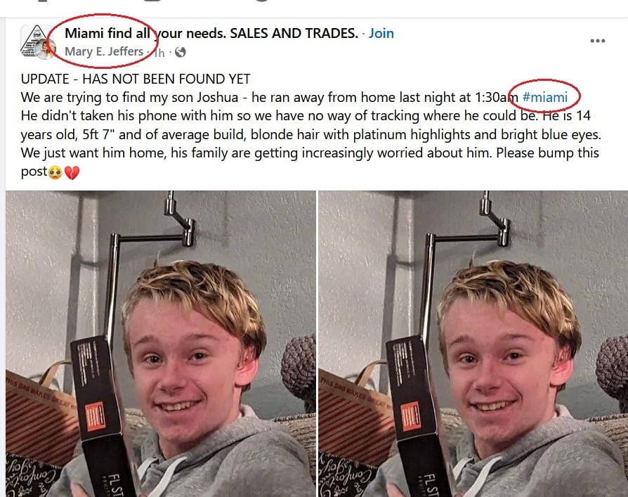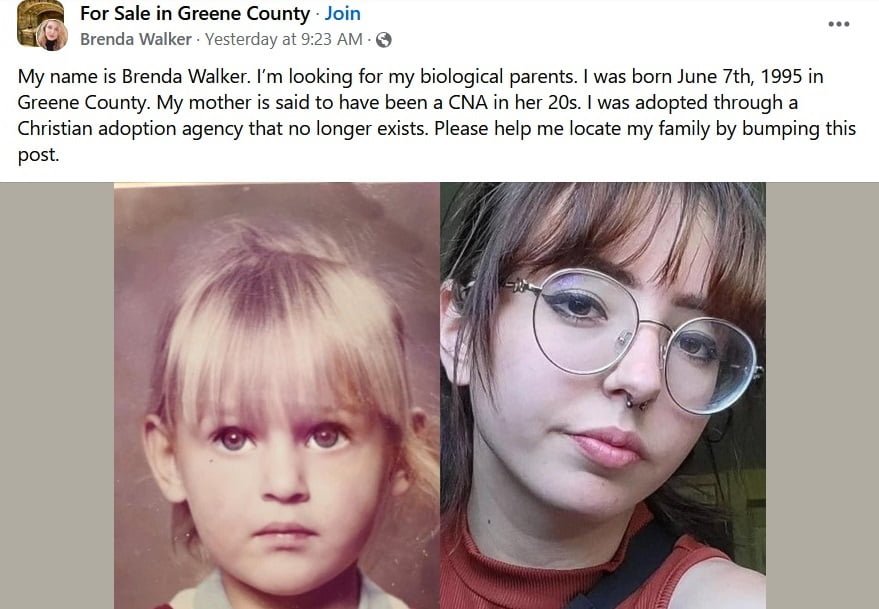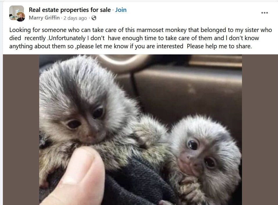 These two examples are looking to rehome a monkey, and looking for biological parents. I’ve seen other similar posts as well. I don’t have a screenshot for it, but a while back I saw one going around that claimed siblings were separated and adopted out decades before, and the poster was trying to find them. I’ve also seen many trying to “give away” various kinds of animals due to the owner dying or some such.