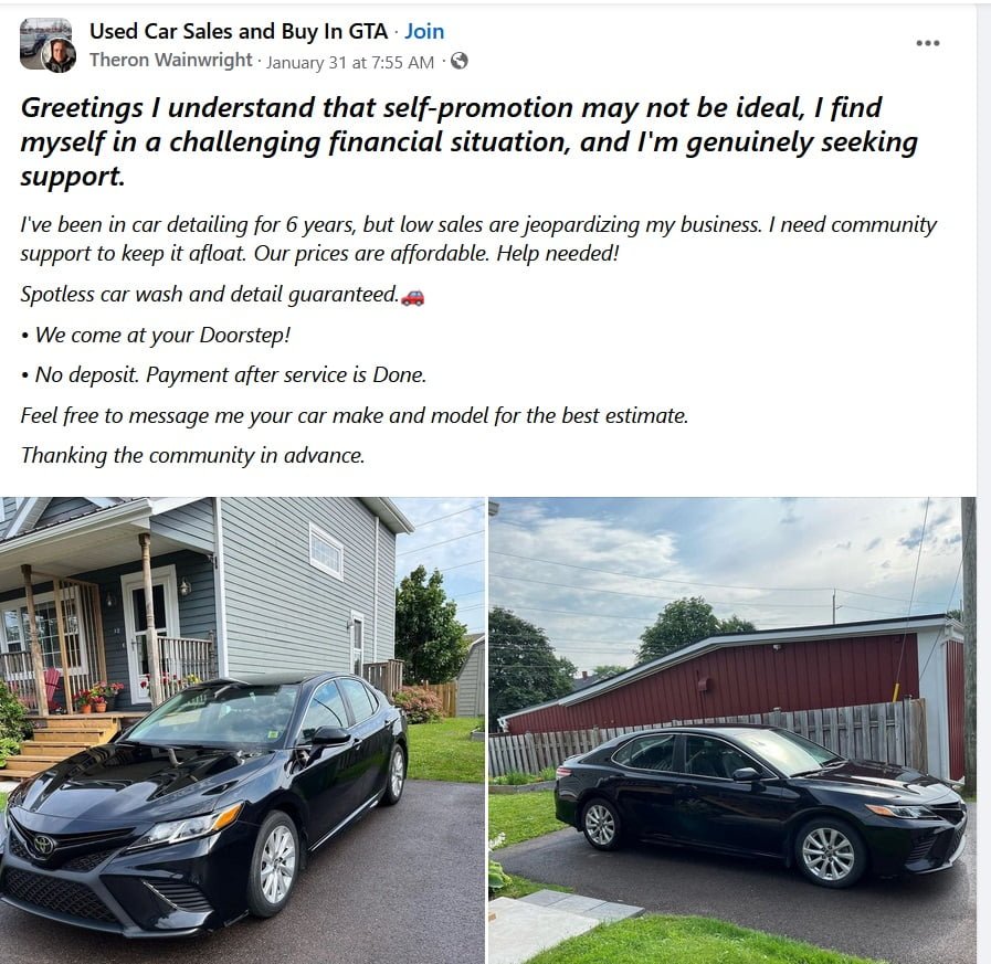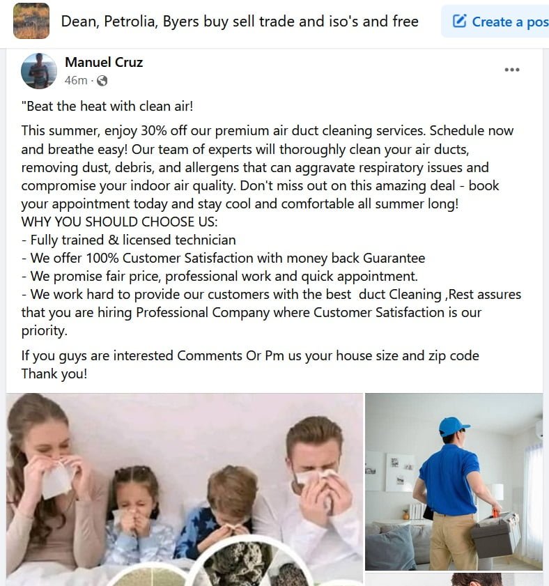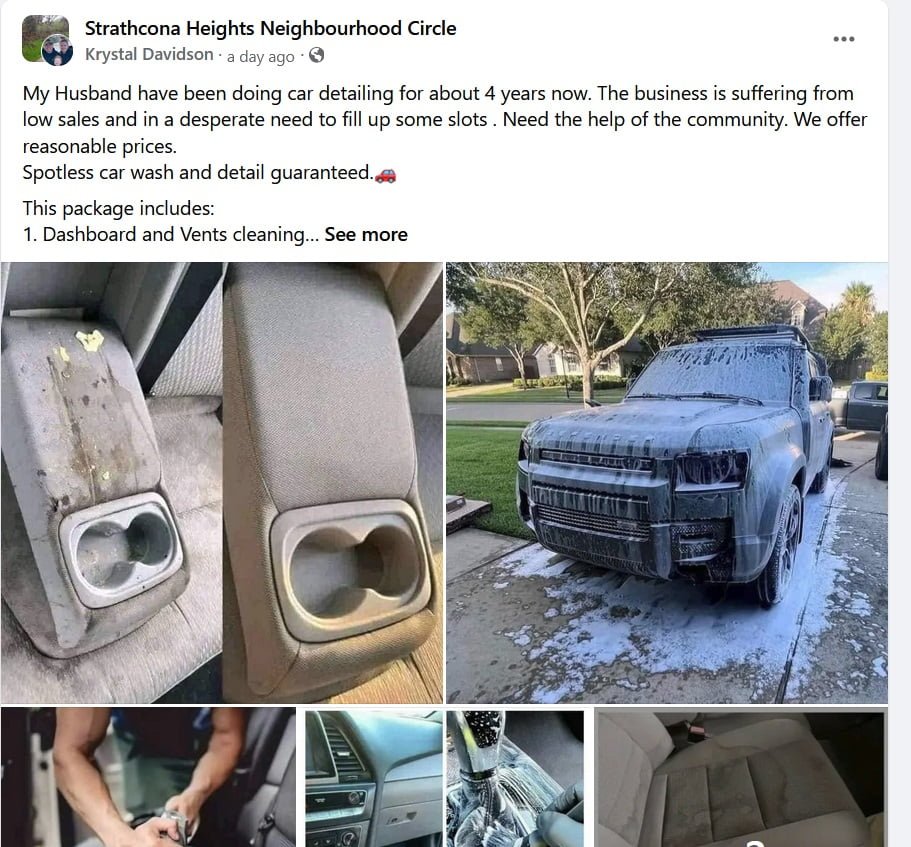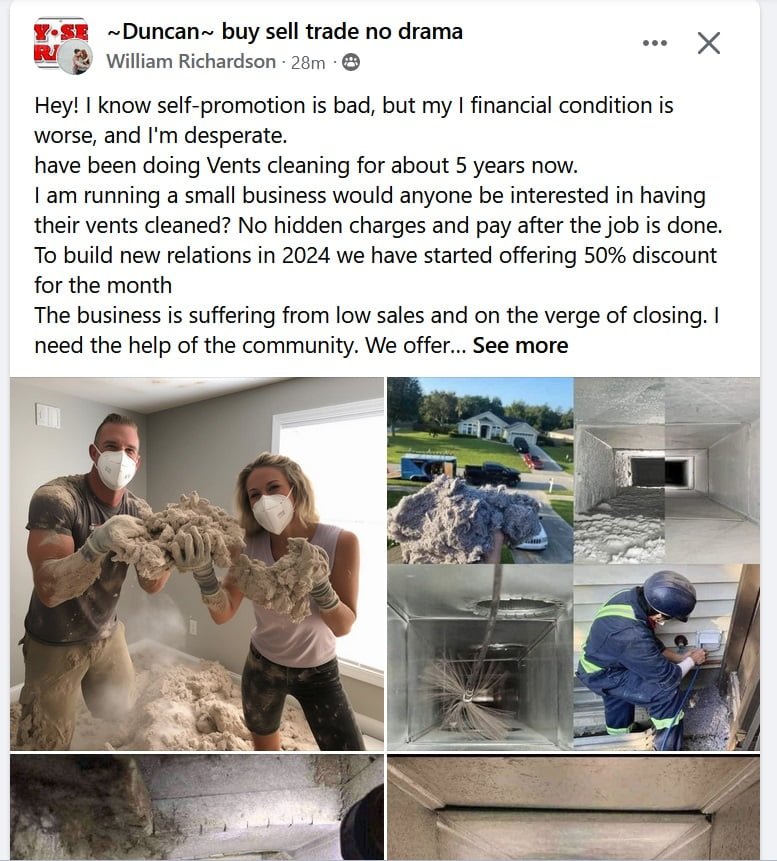 These people pretend to be local, and they provide services people need. It’s almost always duct cleaning and car detailing, but I’ve seen other offers also.