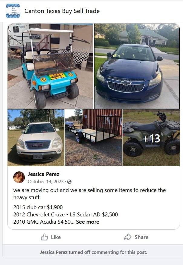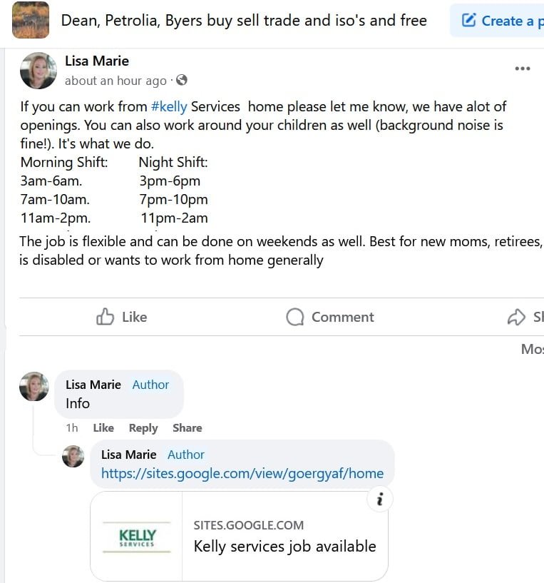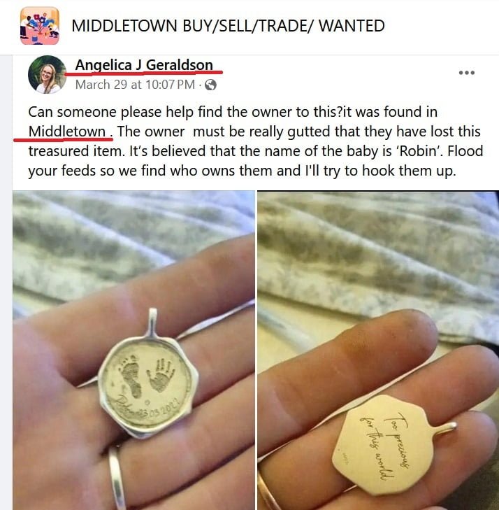 The following is a tiny sampling of screenshots I’ve taken. Each and every one of these was posted many times by various fake profiles in groups all over the country. They just change the town name to match the group they’re posting it in.