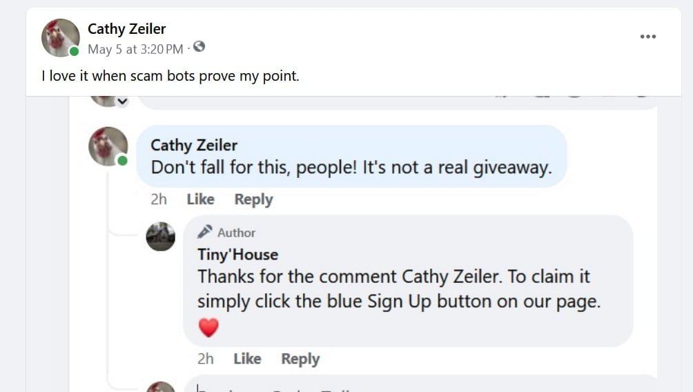 Here’s a response I made in a Tiny House giveaway. Again, the spam bot doesn’t recognize the warning.