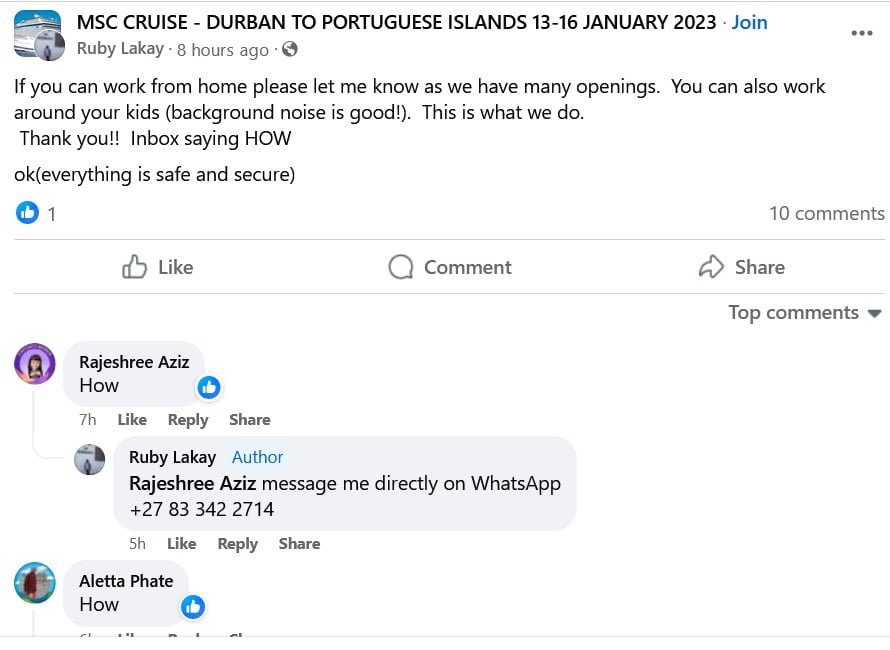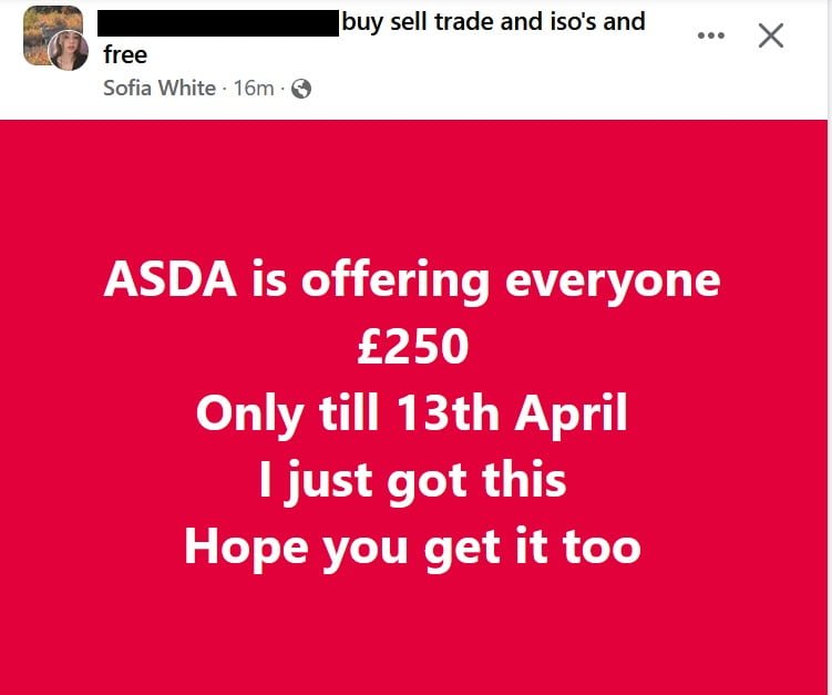 The scammer wants you to complete a survey or go to a website to sign up to take surveys for big rewards. There are legitimate survey companies, but they don’t post ads in Facebook groups. Don’t fall for it.
