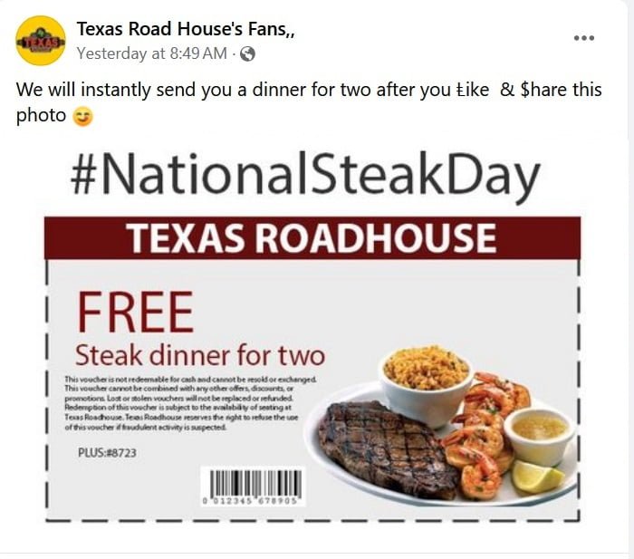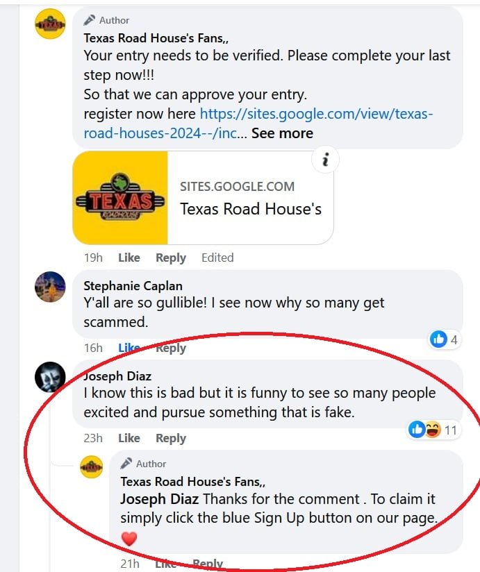 The first two images below are for a free steak dinner. Note how some people try to warn other users, and the spam bot doesn’t recognize the warning.