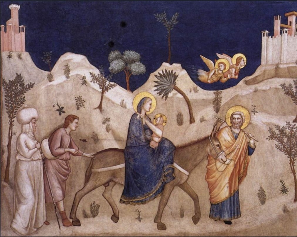 We’ve all seen pictures of Mary and Joseph traveling to Egypt, Mary on a donkey holding the baby. Joseph walking alongside. There must be hundreds of paintings with this theme dating from medieval times to the present, like this one by Giotto, painted some 650 years ago.