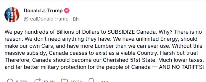 The stats for December haven’t been released yet, but for the eleven months covering January – November 2024, Canada imported a little over $322B in goods from the US, and the US imported a little over $377B in goods from Canada. That’s a $55B deficit for the US.
