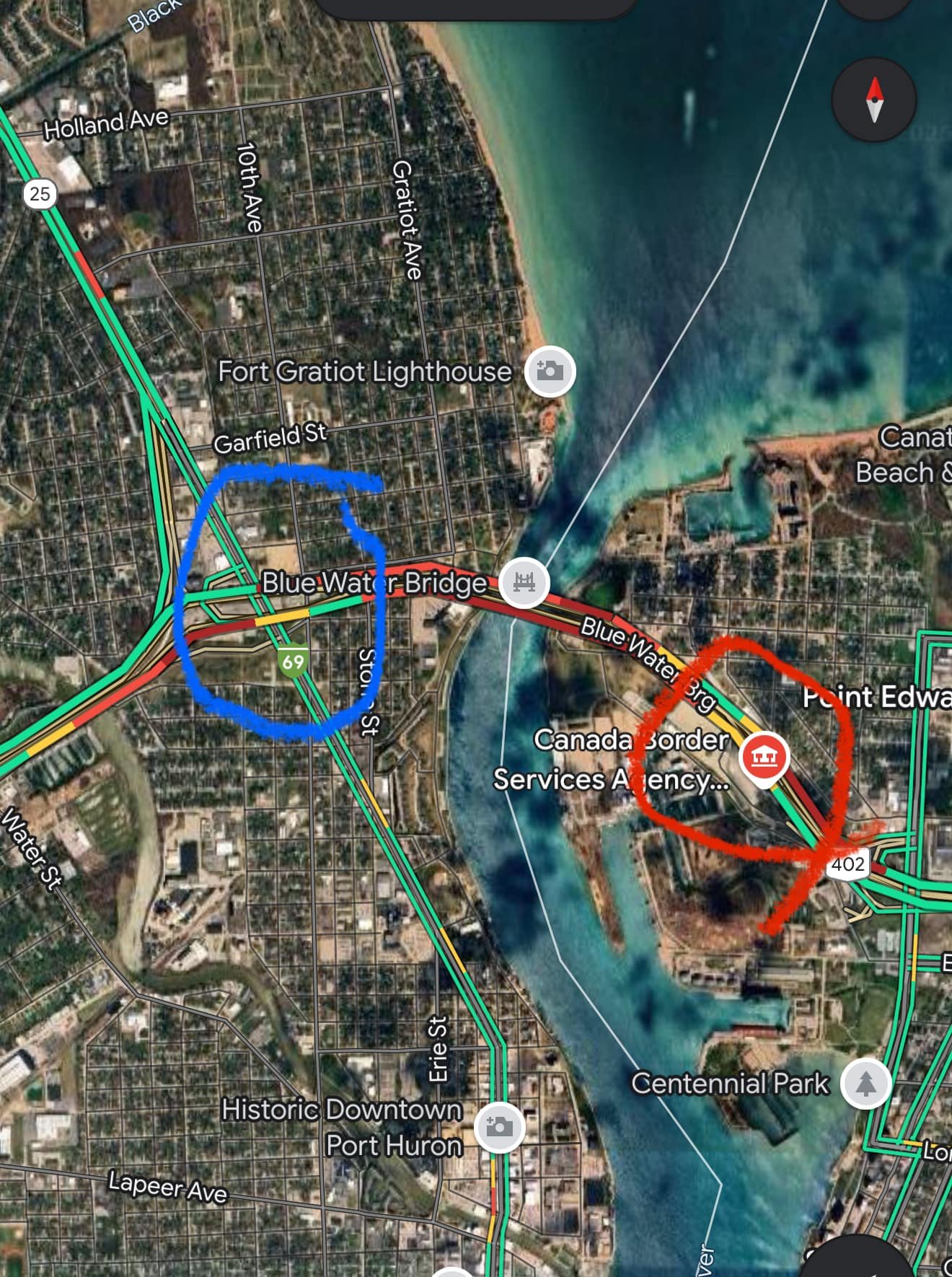 In the map image below you will see the border crossing in Sarnia. As a commercial driver we refer to its 0440 BWB.