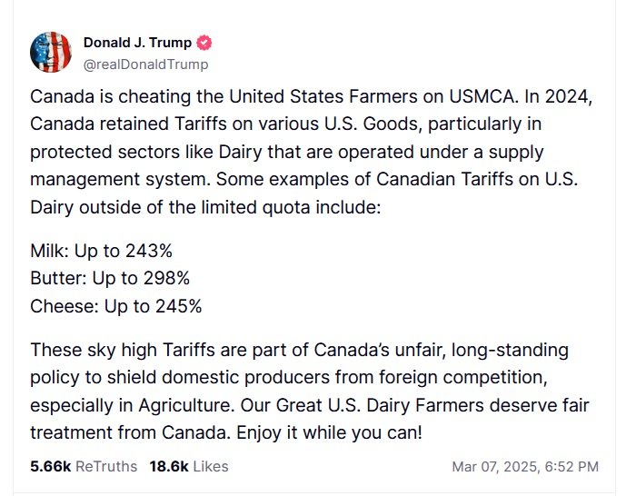 Canada has ZERO tariffs on imported American dairy and poultry as long as the quota limits aren’t exceeded. Since the quotas haven’t been exceeded since USMCA went into effect, those tariffs haven’t been enacted. Trump has obviously forgotten that he and Canada worked out these details during his first term.