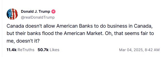 Not true. 16 US banks are operating in Canada. U.S. banks make up half of all foreign bank assets in Canada.