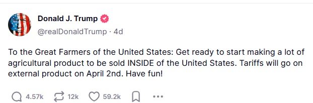 Whatcha talkin’ about Willis? Tariffs make farmers lose half their markets. Farmers will be going bankrupt like they did when you imposed tariffs in your first term.