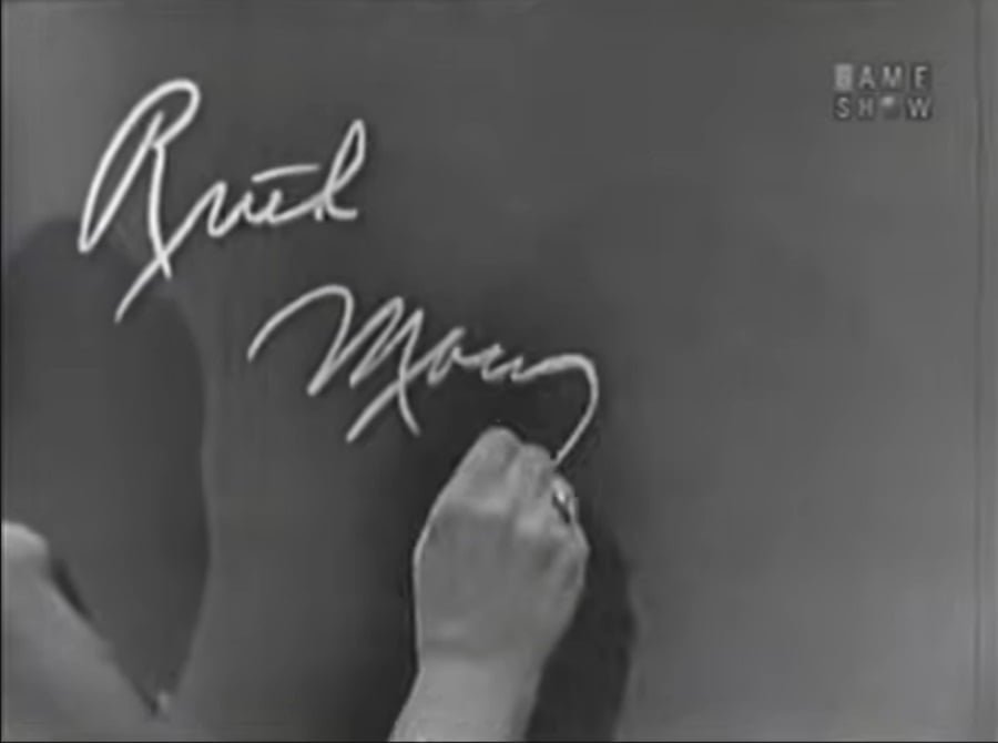 If you’re not familiar with that one, it works like this: four celebrity panelists guess the occupation of the contestant by asking questions which can only be answered “yes” or “no”. When the contestant first enters the stage, the camera focuses on their hand signing a chalkboard, and the TV audience can’t see the person until the name is signed, as this image shows: